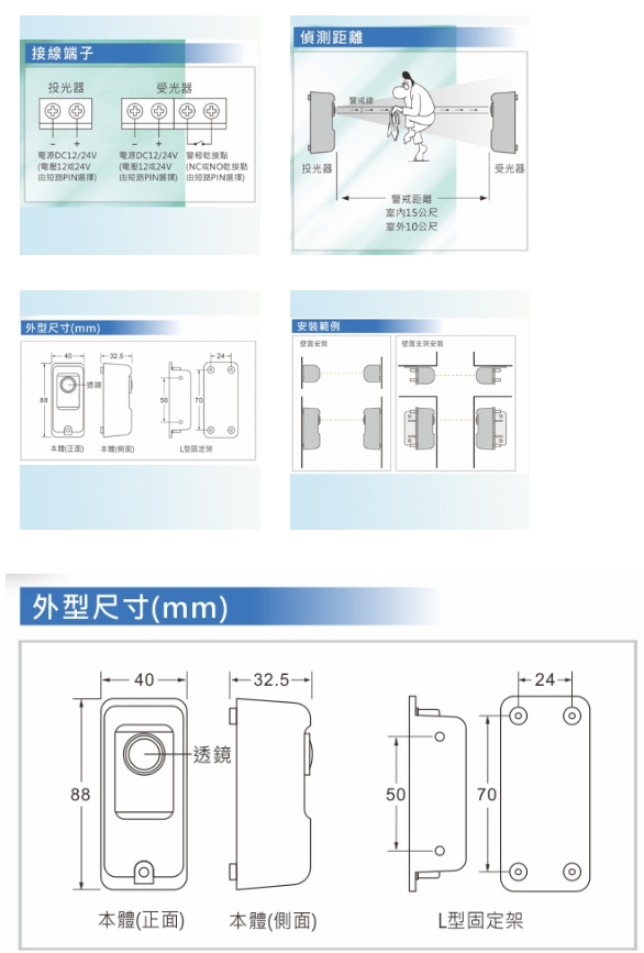 • LED指示: 受光器動作指示LED警戒中(熄)., 警報動作(亮)