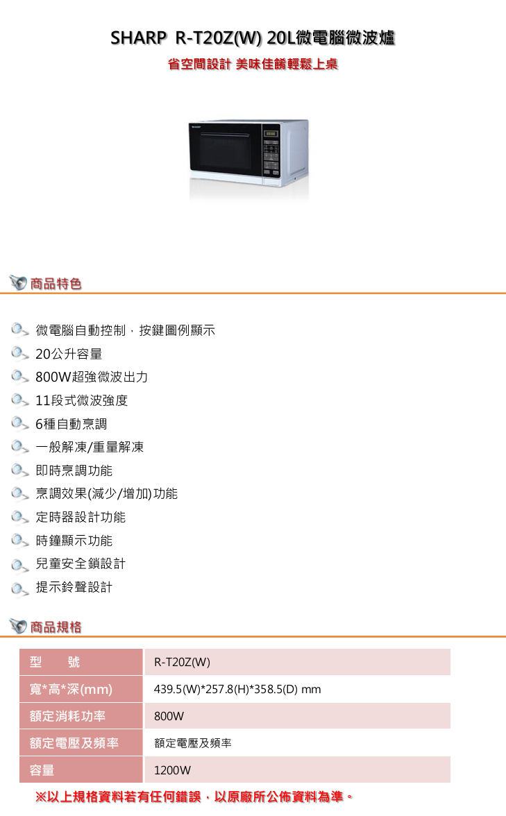 專案限量SHARP R-T20Z(W) 20L微電腦微波爐 800W超強微波出力 11段式微波強度 6種自動烹調 兒童安全鎖設計 一般解凍/重量解凍功能