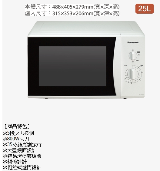 Panasonic國際牌 NN-SM332 25L機械式微波爐 *5段火力控制 *800W火力 *35分鐘烹調定時 *大型鏡面設計 *特易潔塗裝爐體 |