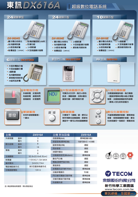 型號:總機電話.東訊DX-616A主機x1台(可接3外8內)顯示話機DX-9906Ex4台