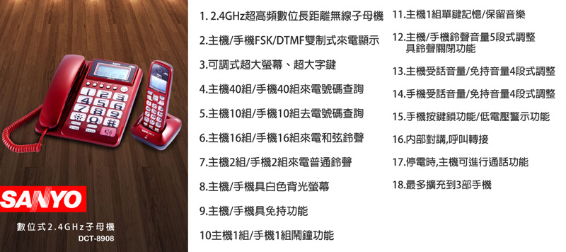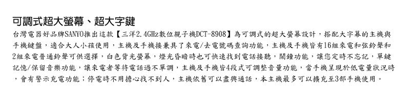 2.4GHz數位式無線電話-->三洋 SANYO DCT-8908 2.4G數位無線電話商品查詢代碼:QK64014