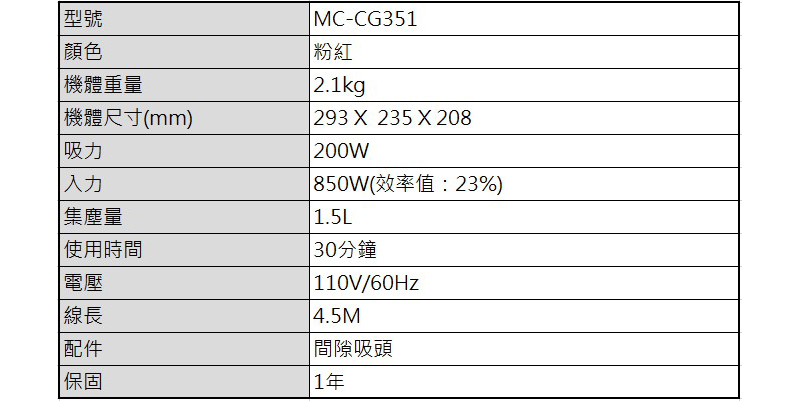 ◆ 2.8kg輕量化設計 本商品規格型號:MC-CG351