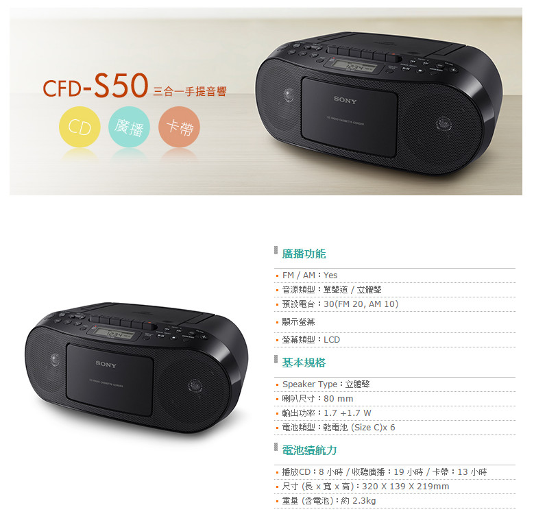 Logitech多媒體喇叭-->SONY 三合一 手提音響 CFD-S50 商品查詢代碼:QK65306