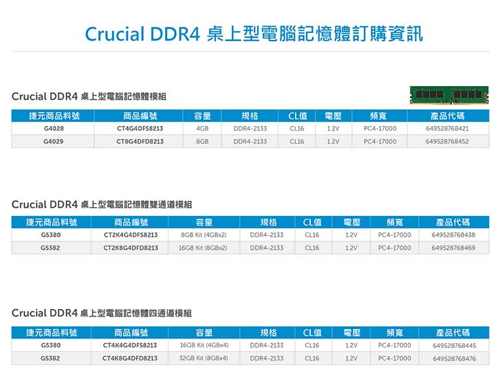 記憶體-->Micron Crucial DDR4 2400/8G RAM(原生顆粒)(單面)商品查詢代碼:QK66099