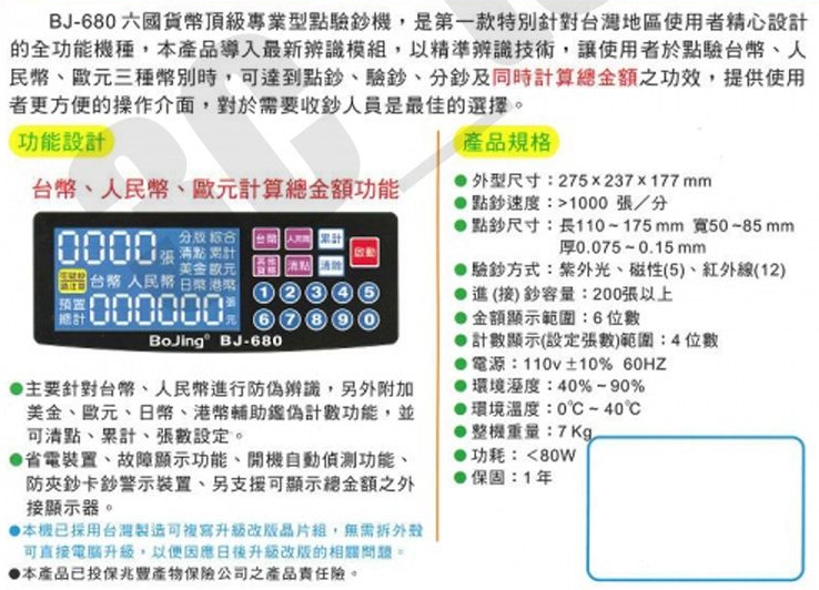 BoJing BJ-680 頂級專業六國貨幣點鈔驗鈔機