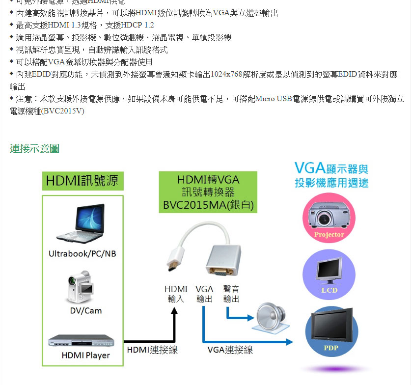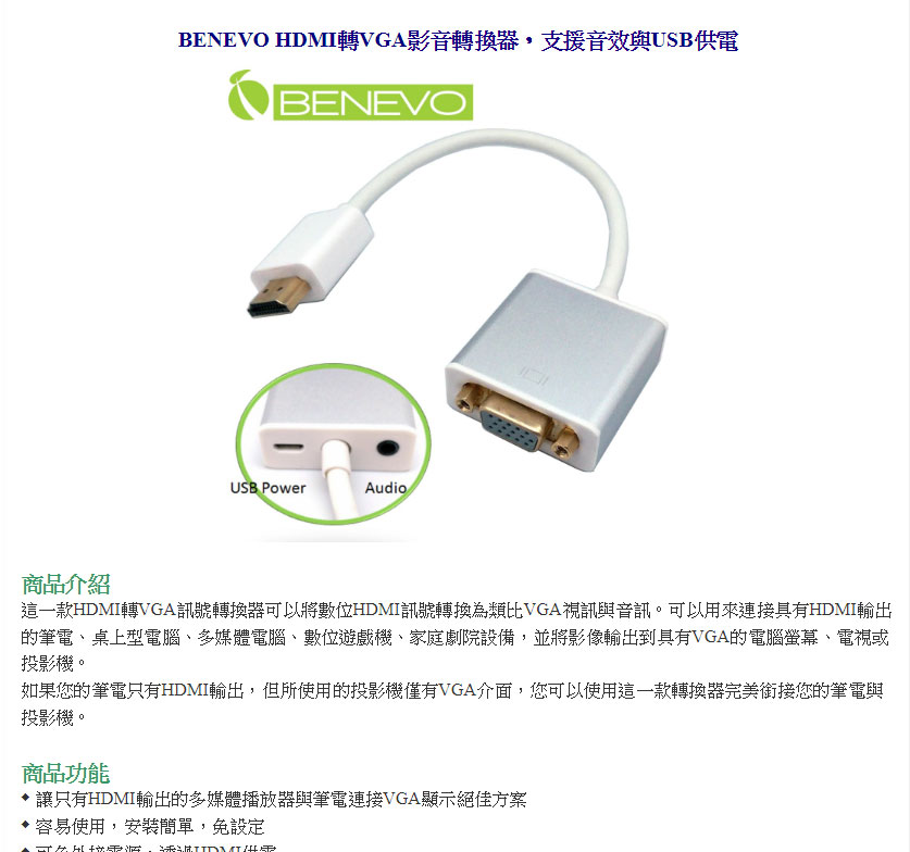 HDMI-->BENEVO HDMI轉VGA影音轉換器,支援音效與USB供電 ( BVC2015MAS )商品查詢代碼:QK69422