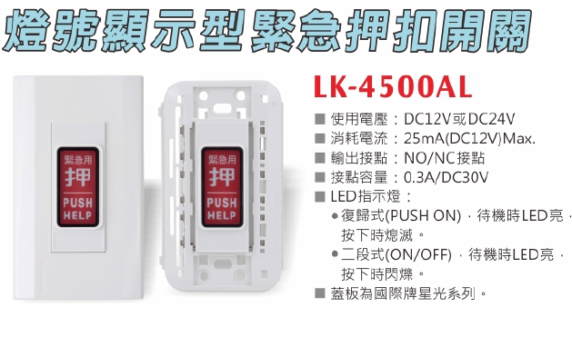 型號:LK-4500AL-2: 雙輸出 二段式 (ON / OFF): 待機時LED亮, 按下時閃爍, 按下時熄滅 燈號顯示型緊急押扣開關 LK-4500AL-2: 雙輸出