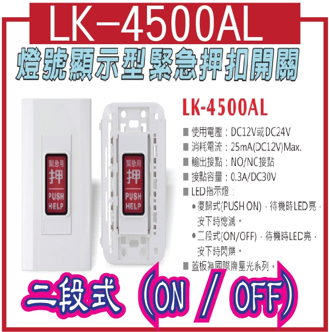 使用電壓: DC12V 或 DC24V消耗電流: 25 mA (DC12V) Max輸出接點: NO / NC 接點接點容量: 0.3 A / DC30V指示燈 LED復歸式 (PUSH ON): 待機時LED亮, 按下時熄滅二段式 (ON / OFF): 待機時LED亮, 按下時閃爍蓋板為國際牌星光系列 |