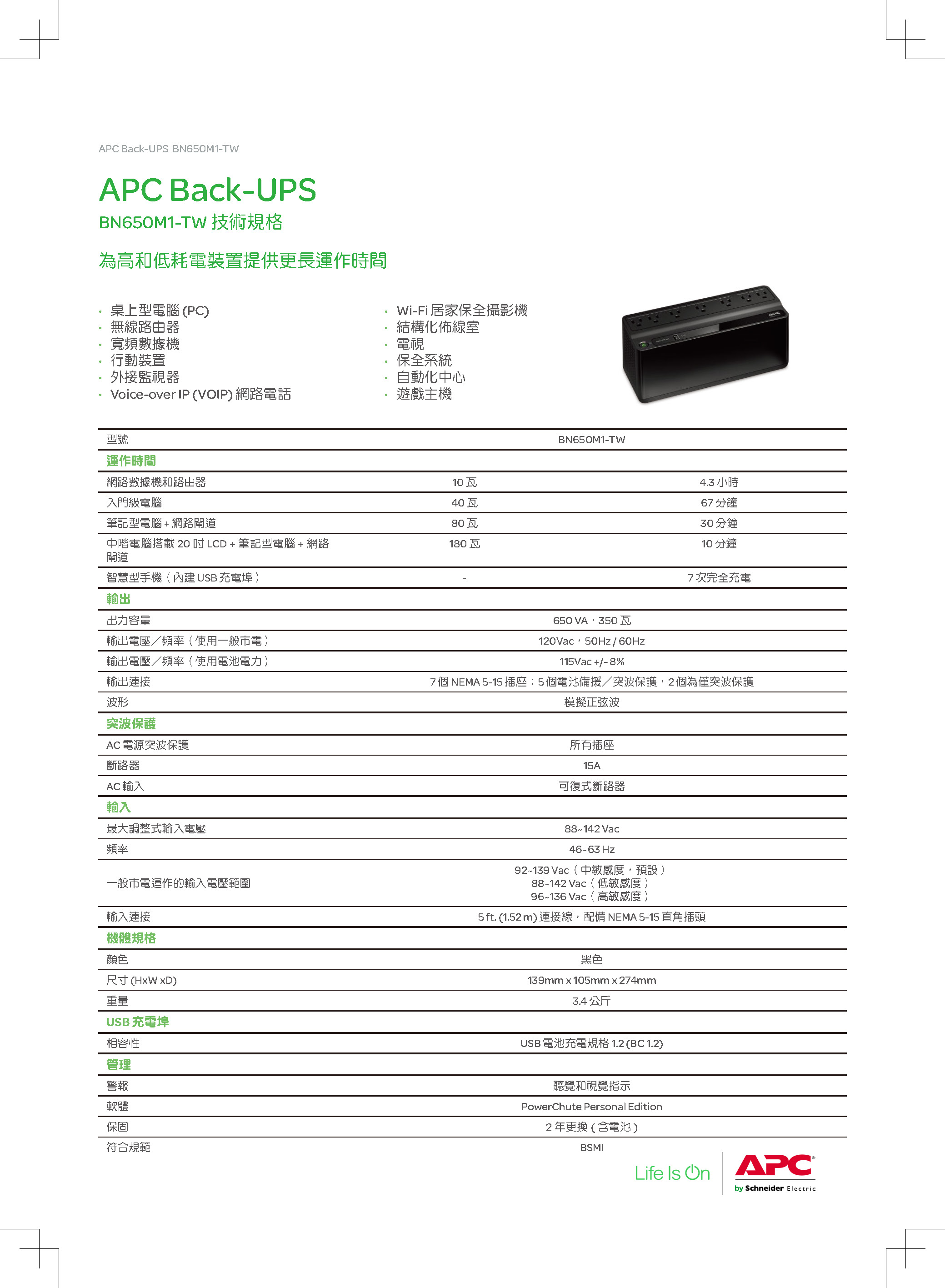 APC-UPS--> APC BN650M1-TW 商品查詢代碼:QK78837