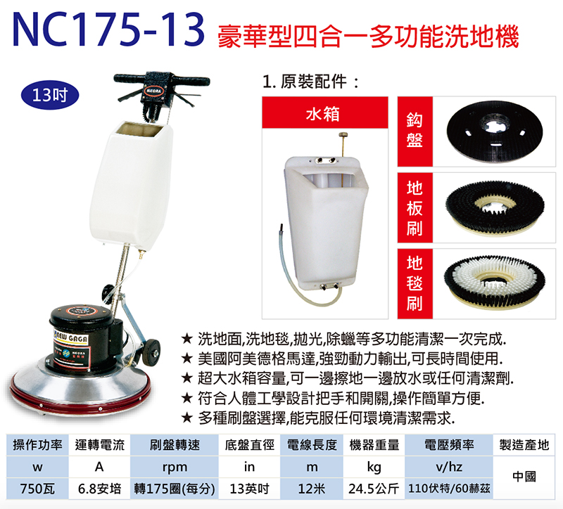 型號:尼歐拉NC175-13豪華型四合一多功能洗地機(13吋)