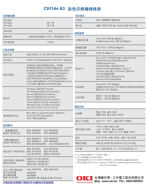 型號 :OKI C911dn A3,黑白/彩色50PPM