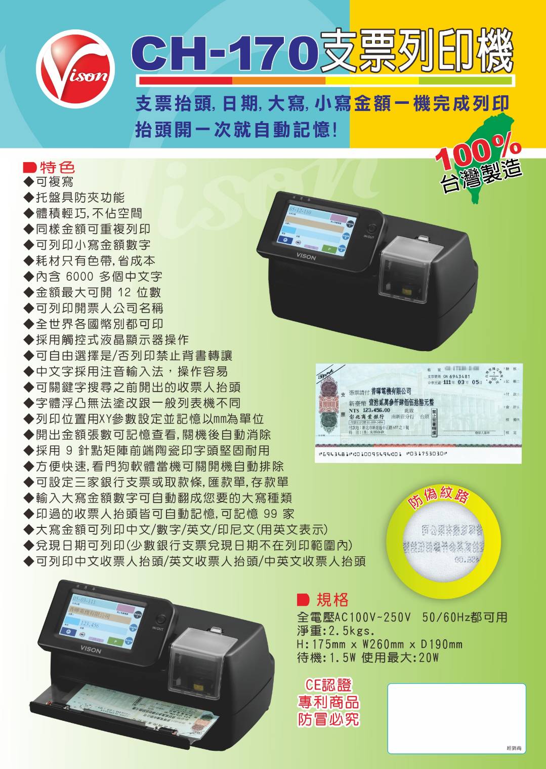 電子支票列印機 CH-170 台灣製造 (不用手寫支票抬頭、日期、金額)