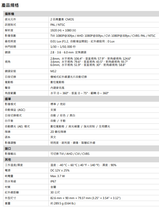 型號:HD2076DFSHD 1080P 半球型同軸音頻紅外線攝影機