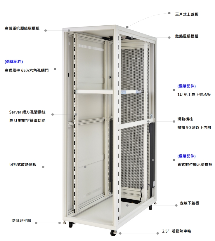 型號:J800 20U-90 白色 加寬型伺服器機櫃 依據ANSI/EIA RS-310C規範製造◎ 通過工研院MIL-STD-167振動測試認證 ◎ 通過CNS-3511耐壓測試2000kg認證 ◎ 具UL、CE、CSA安規認證 下單後3到5天組裝交貨