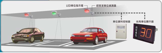 安裝在每個車位正上方, 採用超音波測距的工作原理採集停車位的及時數量, 透過 RS-485 通訊回到車位資料控制器及車位顯示器