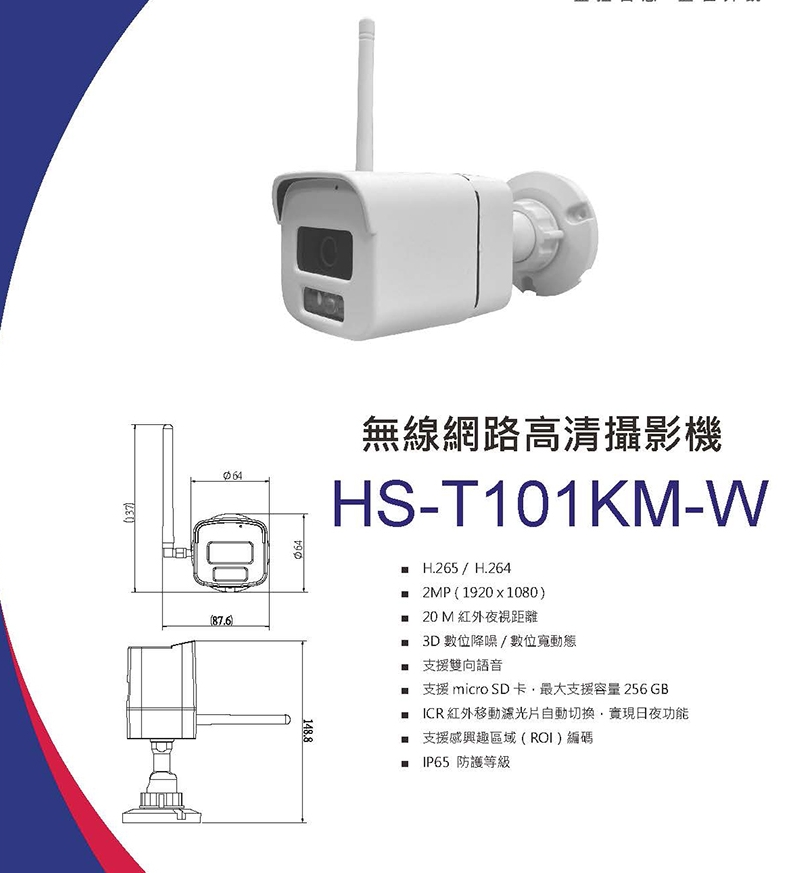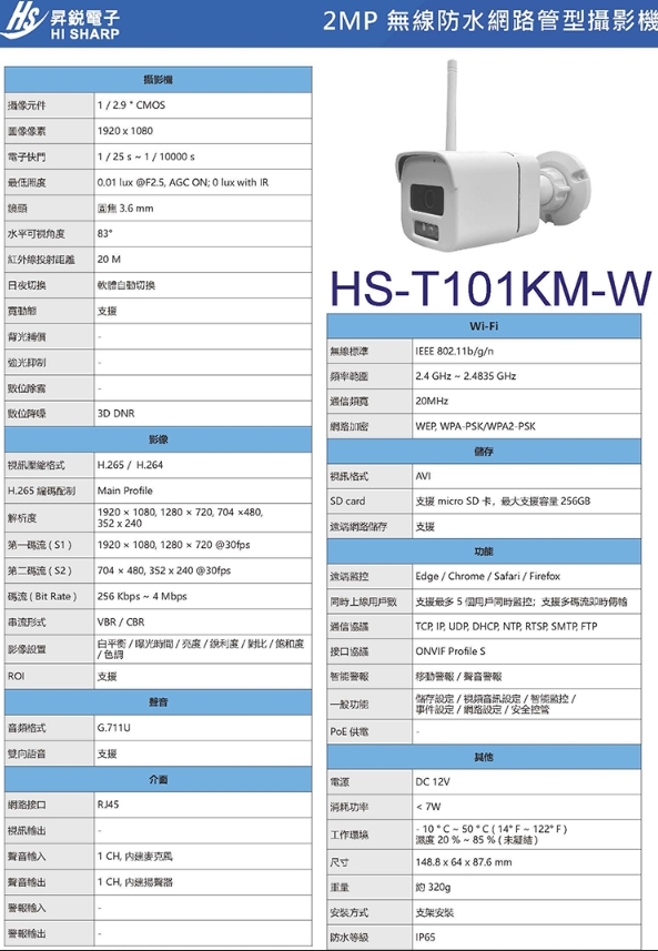 專案限量T101KM 他就是一般的安防網路攝影機他多了Wi-Fi功能昇銳 Hi-Sharp H.265 200萬 雙向語音 無線網路攝影機 支援SD卡 無POE HS-T101KM-W