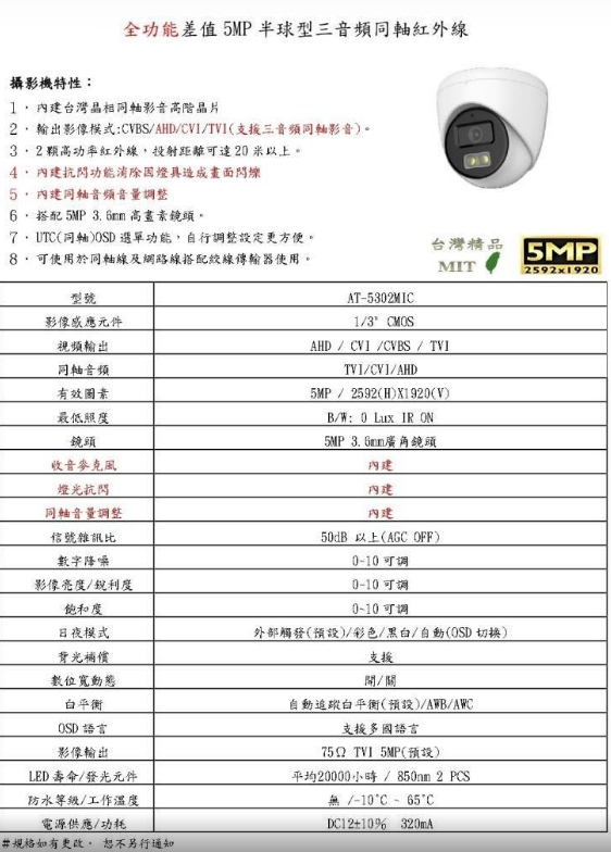 | 專案限量AT-5302MIC 500MP 2592*1920 全功能差值5半球3音頻同軸紅外線拾件超值組合 10送1 限時優惠3天內 | ||||||||||||||