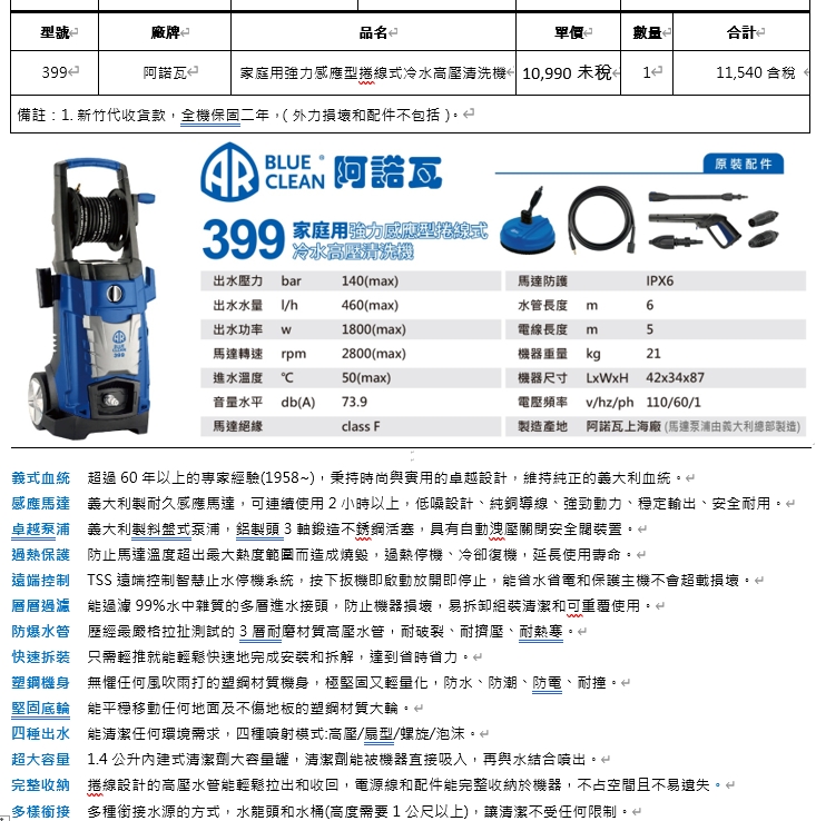 義大利AR 阿諾瓦 399 140bar 家庭用強力感應型捲線式冷水高壓清洗機 洗車機 公司原廠貨 保固2年過熱停機、冷卻復機,延長使用壽命